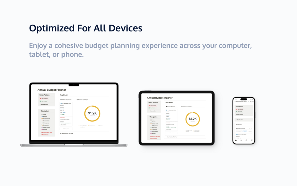 Since the Annual Budget Planner is built on Notion, it can be accessed from any device where Notion is available—laptops, tablets, and smartphones. The template is built to provide a seamless and cohesive experience across all your devices. Your data syncs automatically, so you always have access to your financial information, whether you’re at home or on the go.