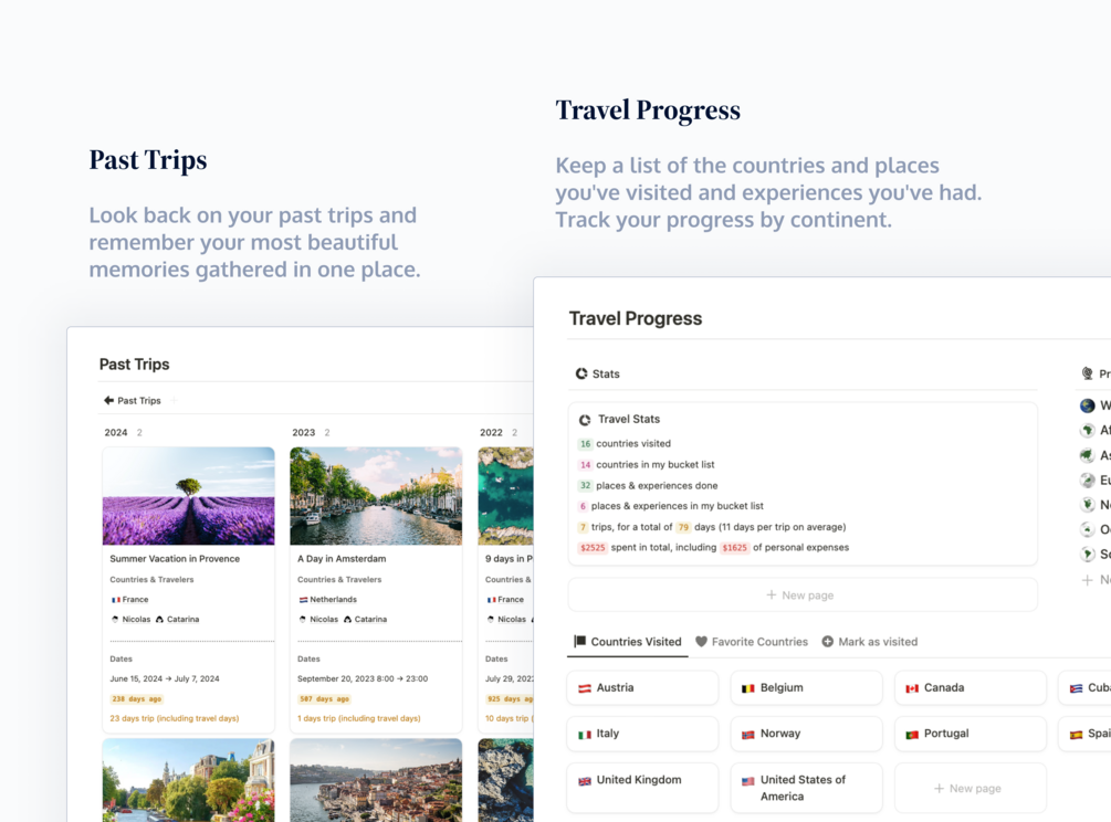 The Explorer Travel Planner for Notion is a complete system to create your bucket list, plan and track your next trips and remember previous ones.