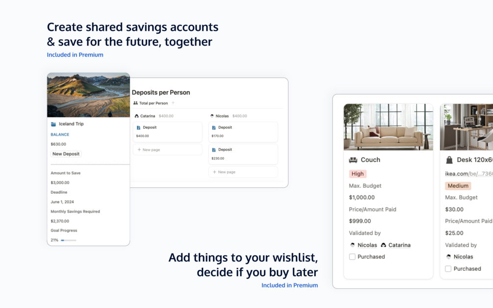 With the Premium version, you can categorize your expenses and set a monthly budget by category to avoid overspending. The subscriptions tracker helps you manage your subscriptions and recurring expenses easily, so you're always aware of upcoming payments and remember to cancel unused subscriptions. The wishlist lets you save products you might want to buy later. And shared savings accounts help you save together for future projects or big purchases.