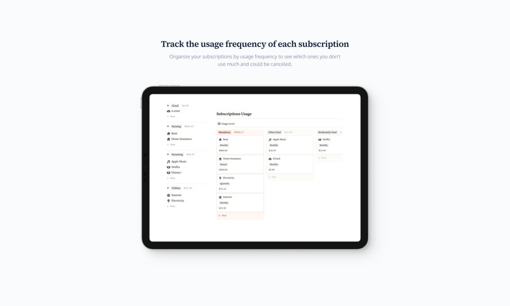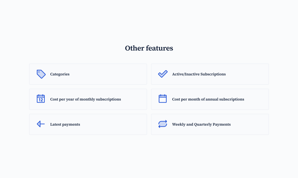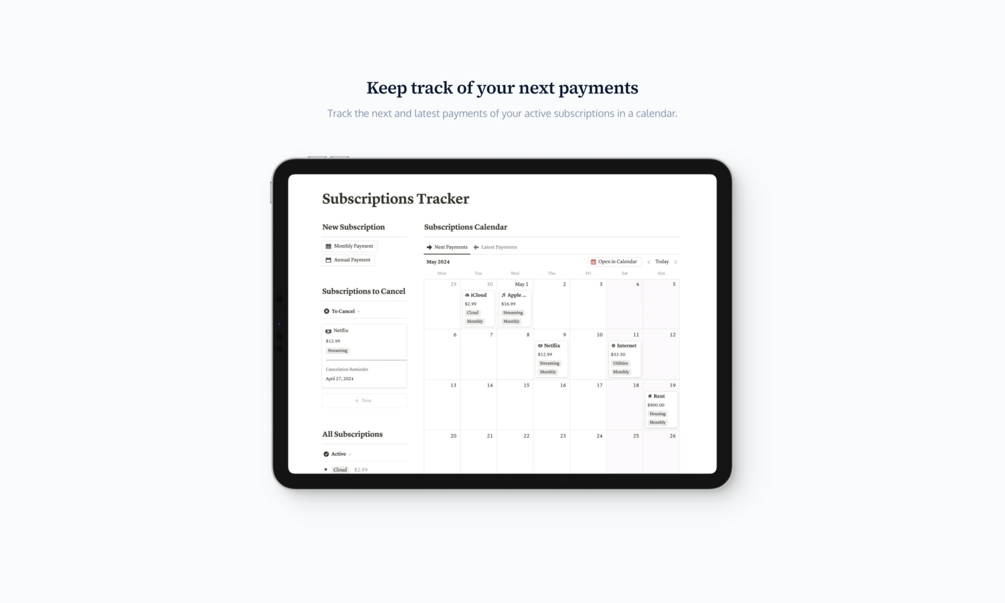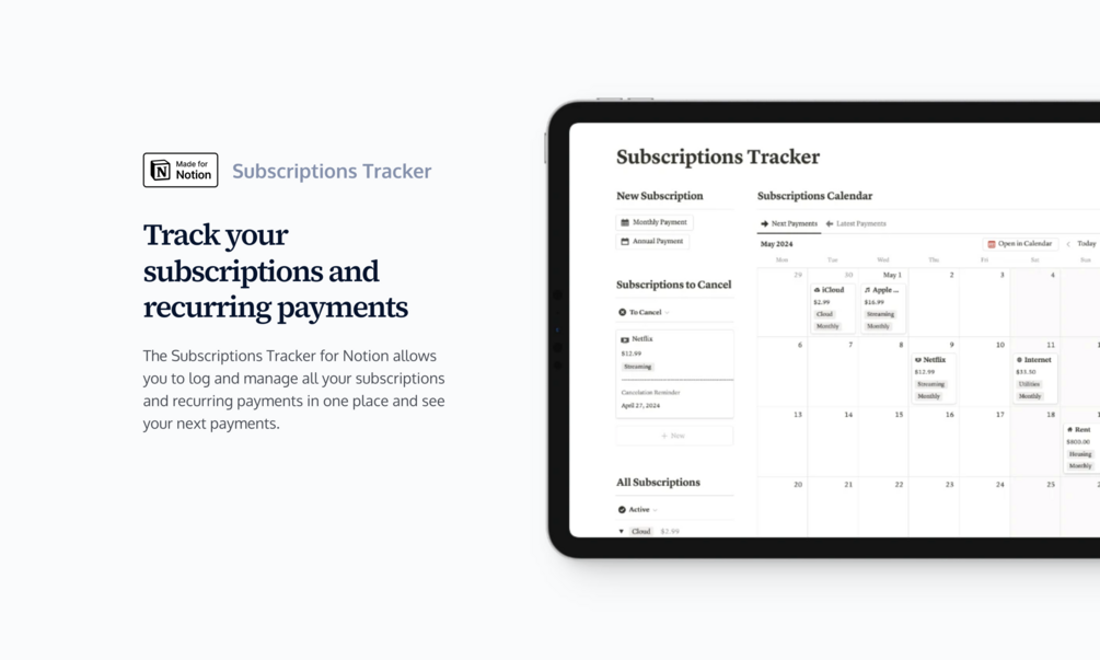 The Subscriptions Tracker for Notion allows you to log and manage all your subscriptions and recurring payments in one place and see your next payments.